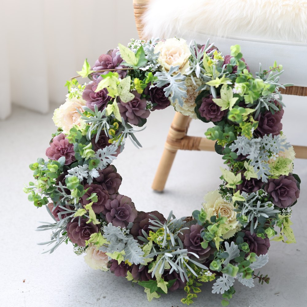 今回のブリコラージュフラワーは、年末に制作したハボタンモカとオレガノのリースです。